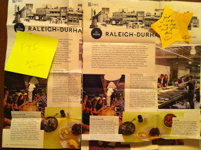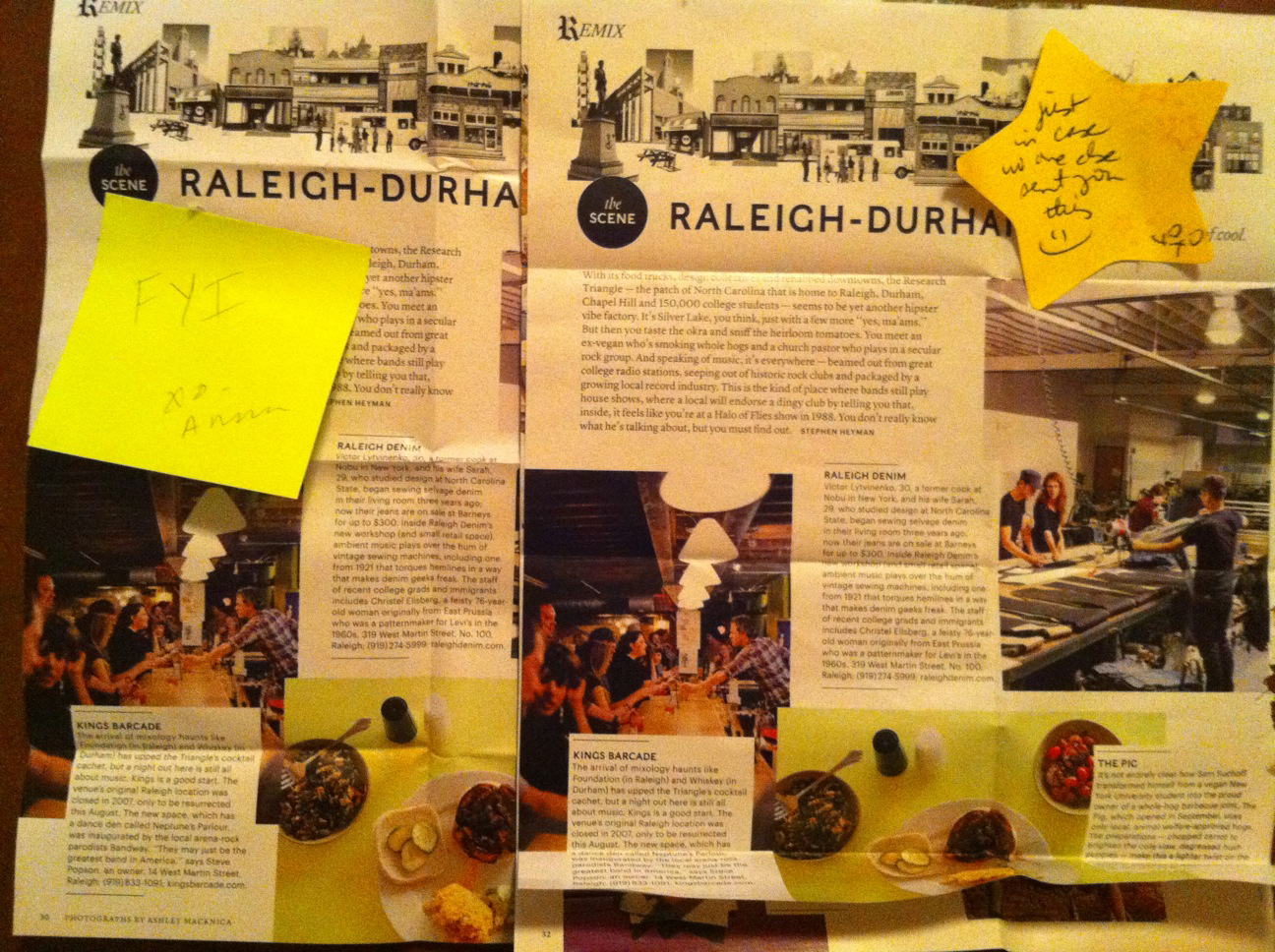 But even better was that I got a cut-out from T-Magazine (of an article with some serious Raleigh love) from not only ONE friend but TWO! On the same day! If I knew that Mike wasn't going make fun of me, I would have cried a little bit just now.